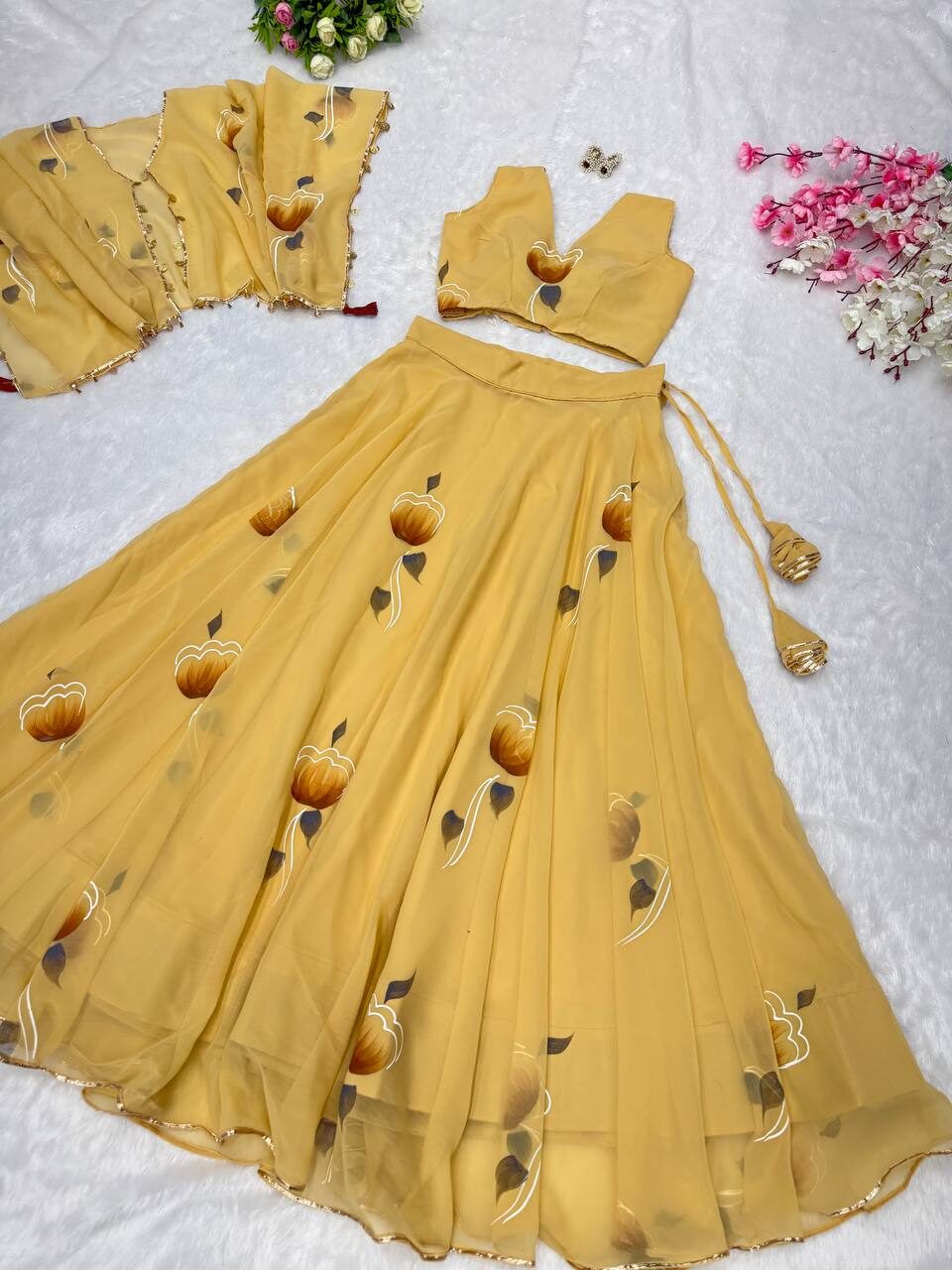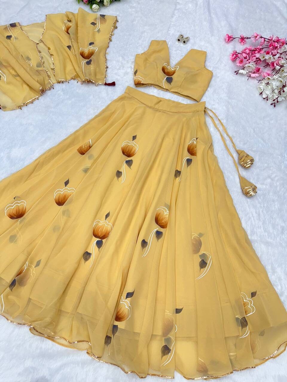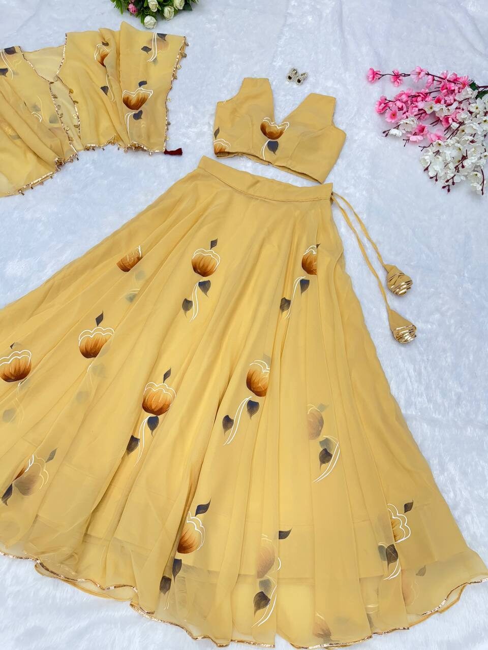 *lehnga* – Georgette hand painted 8mtr flair lehnga with canvas patta and adjustable waist Dori🌸