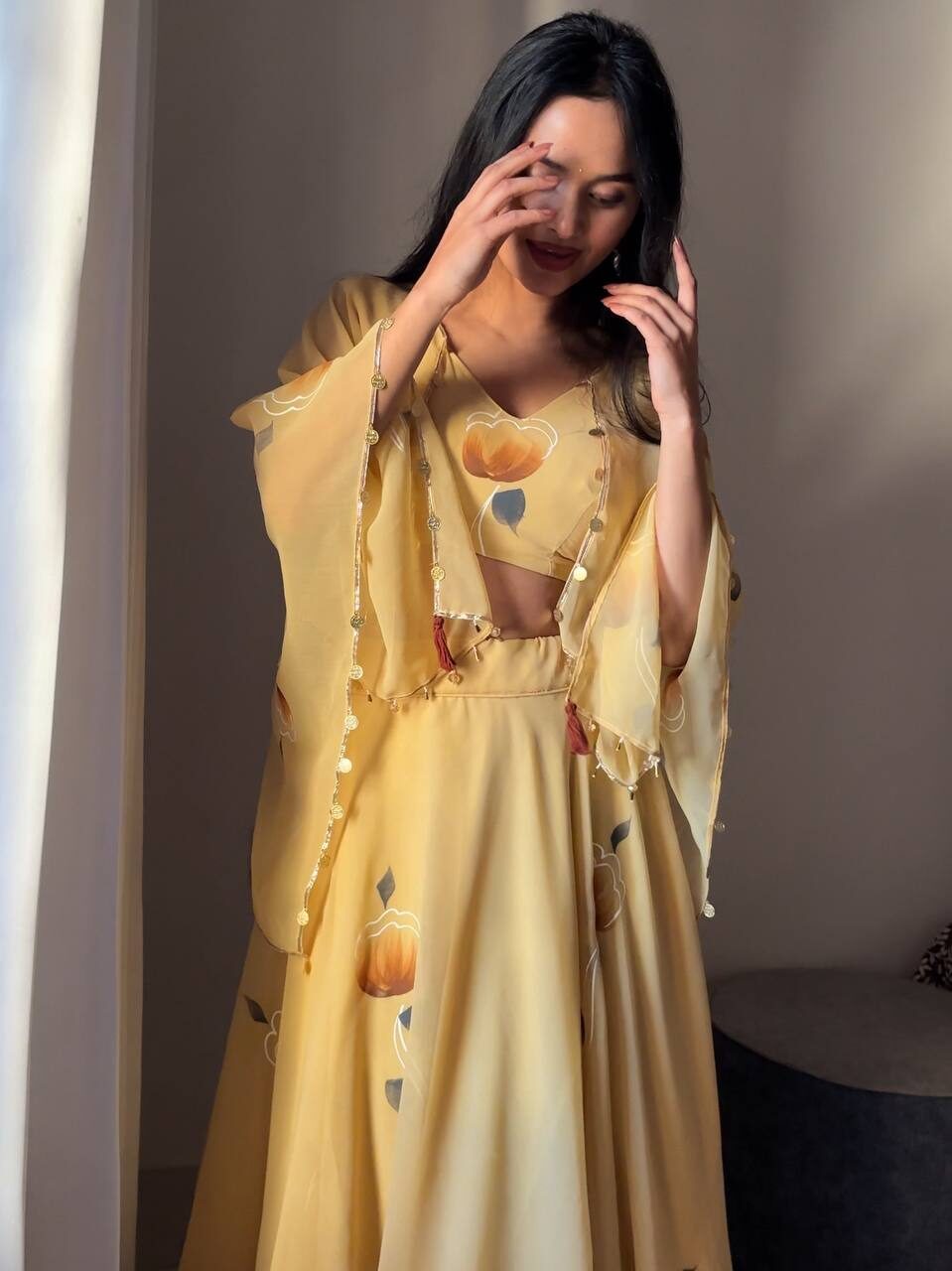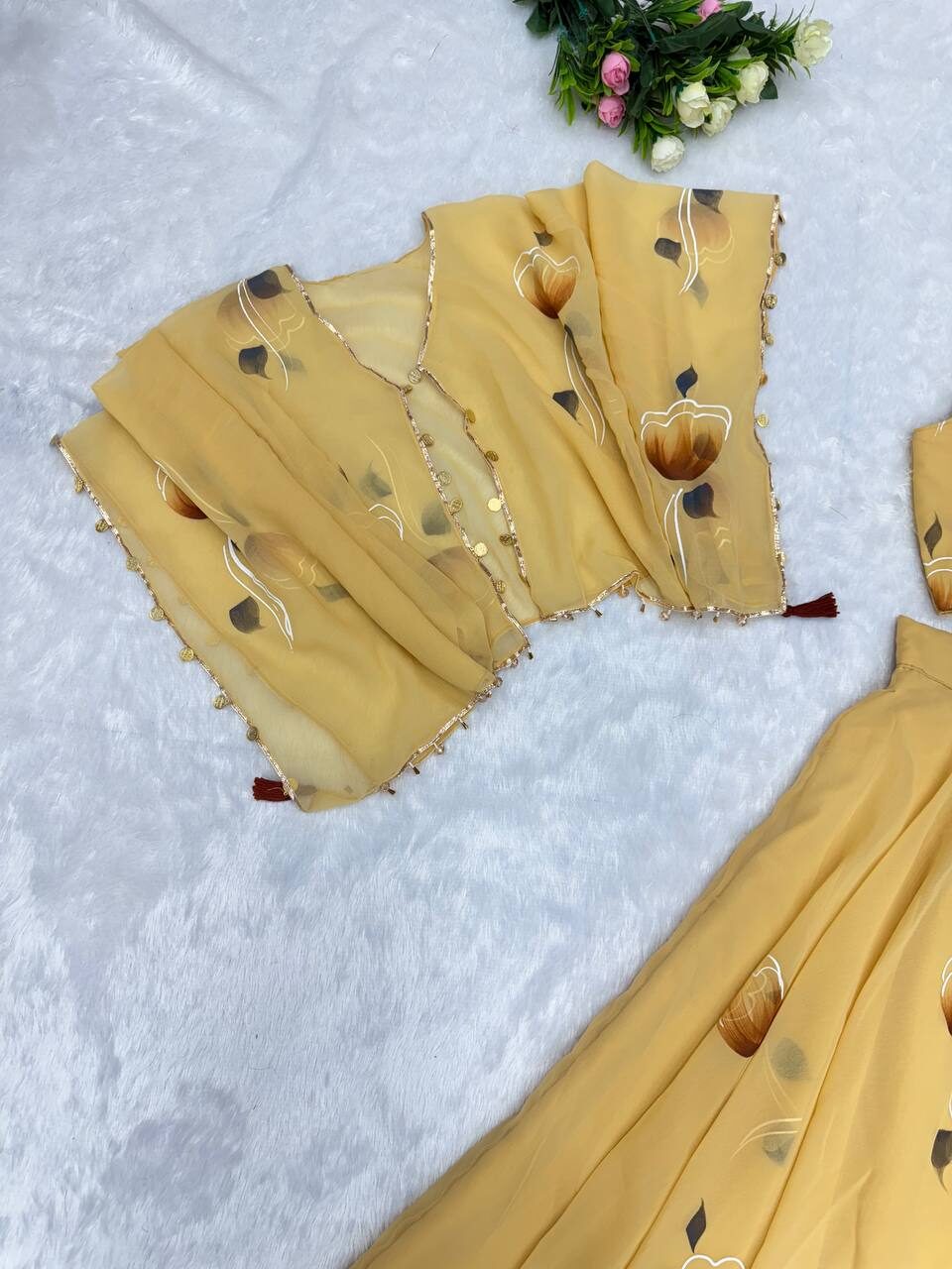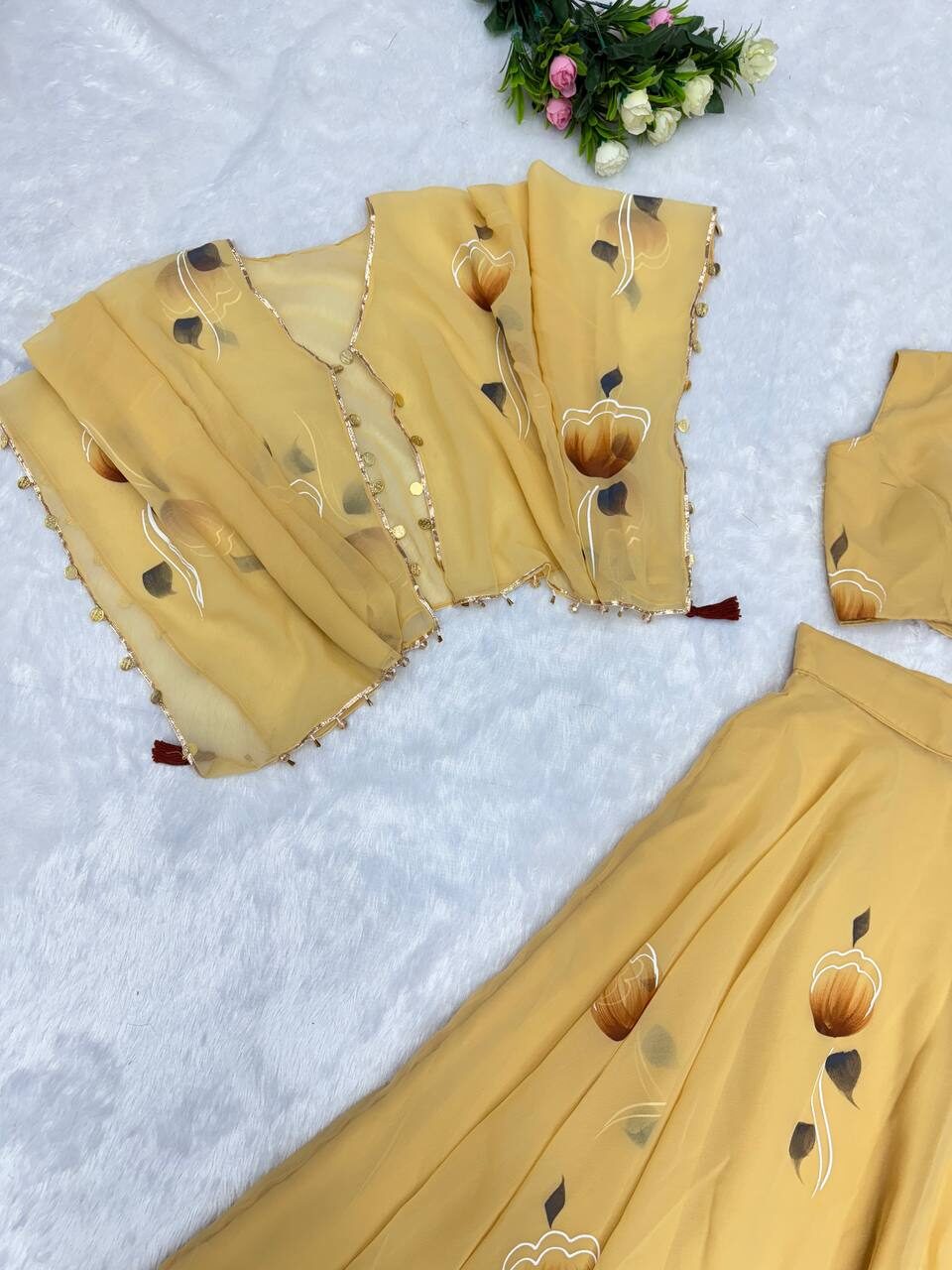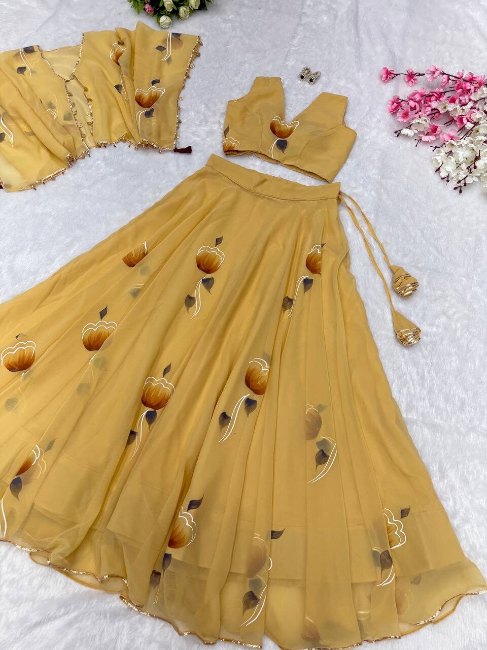 *lehnga* – Georgette hand painted 8mtr flair lehnga with canvas patta and adjustable waist Dori🌸